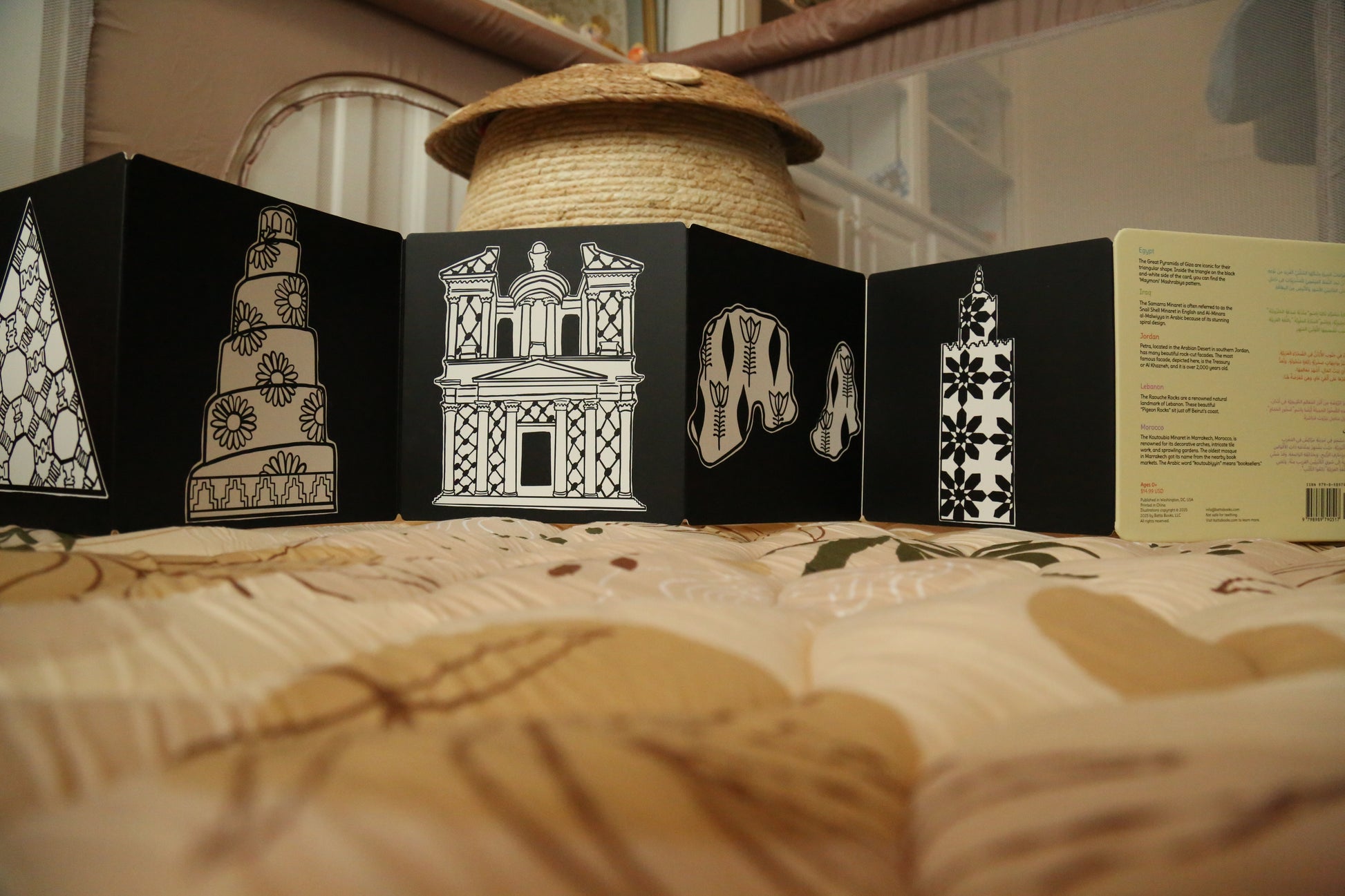 Did you know babies have a hard time distinguishing between colors until their vision improves around 4 months? Artist Lena Kassicieh created beautiful black and white images on one side of the cards with traditional Arab motifs inside the simplified shapes of iconic Arab landmarks and colorful images full of whimsy for when babies are ready to enjoy color in a clear way!