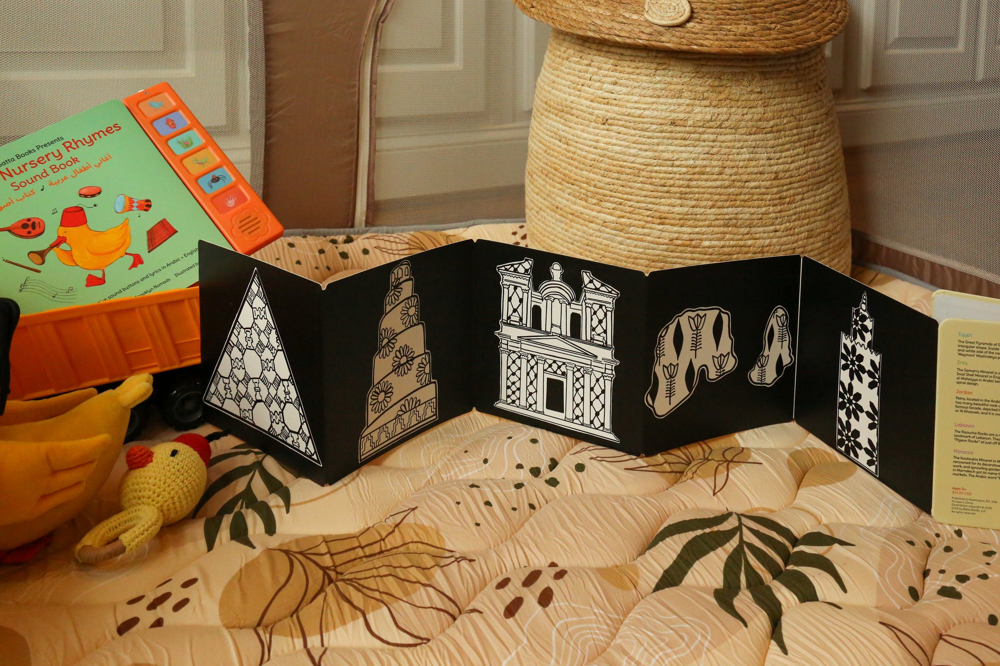 Help expose the babies in your life to beautiful Arab themes and images while developing their vision and neural pathways. This product is perfect for tummy time and folds into an 8x10 book for families on the go! This activity book also promotes concentration skills and can be used to support early language development if you talk to your baby about the images.